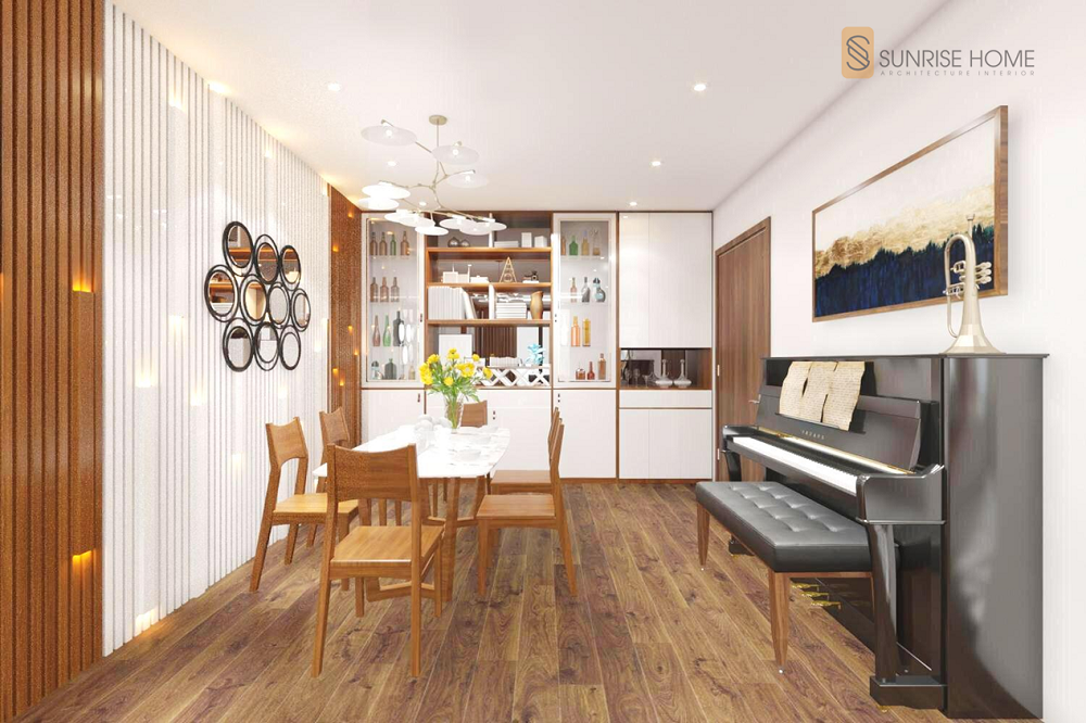 Toàn bộ phòng ăn sử dụng nội thất gỗ tôn lên vẻ cao quý, cộng hưởng với sự bài trí nội thất từ tủ rượu và điểm nhấn của những chiếc gương, giúp căn phòng trở nên ấm cúng, thanh lịch.