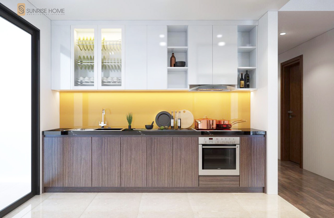 Tủ bếp thiết kế sát trần giúp tận dụng tối đa diện tích chứa đồ.
