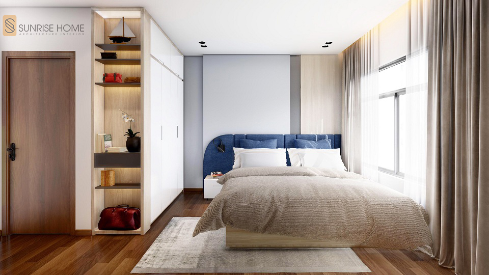 Tông màu trung tính mang đến không gian hiện đại cho phòng ngủ. Hệ tủ quần áo lớn nối liền kệ tủ trang trí được đặt trong phong ngủ mang đến sự hấp dẫn tiện dụng cho căn phòng.