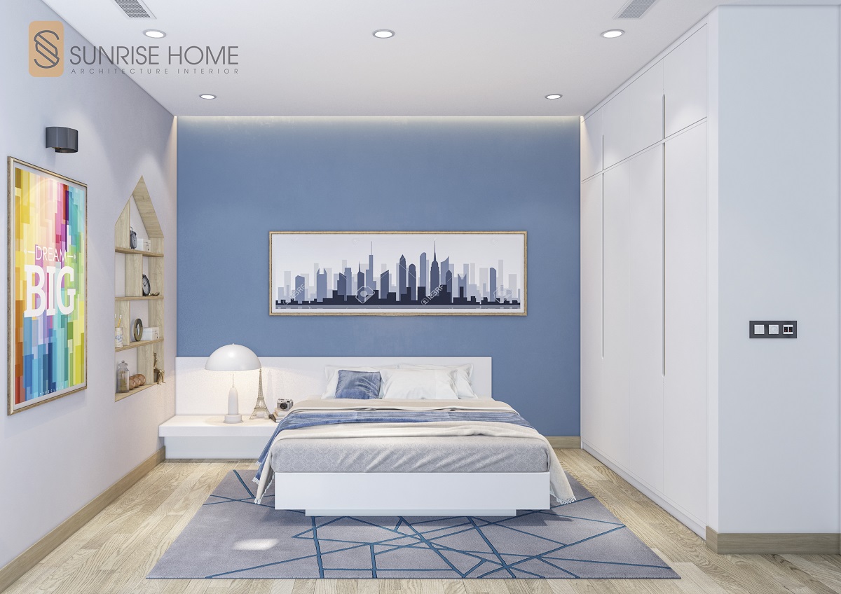 Tông màu xanh nhẹ nhàng kết hợp với những bức tranh treo tường giúp phòng ngủ của con trở nên thu hút hơn bao giờ