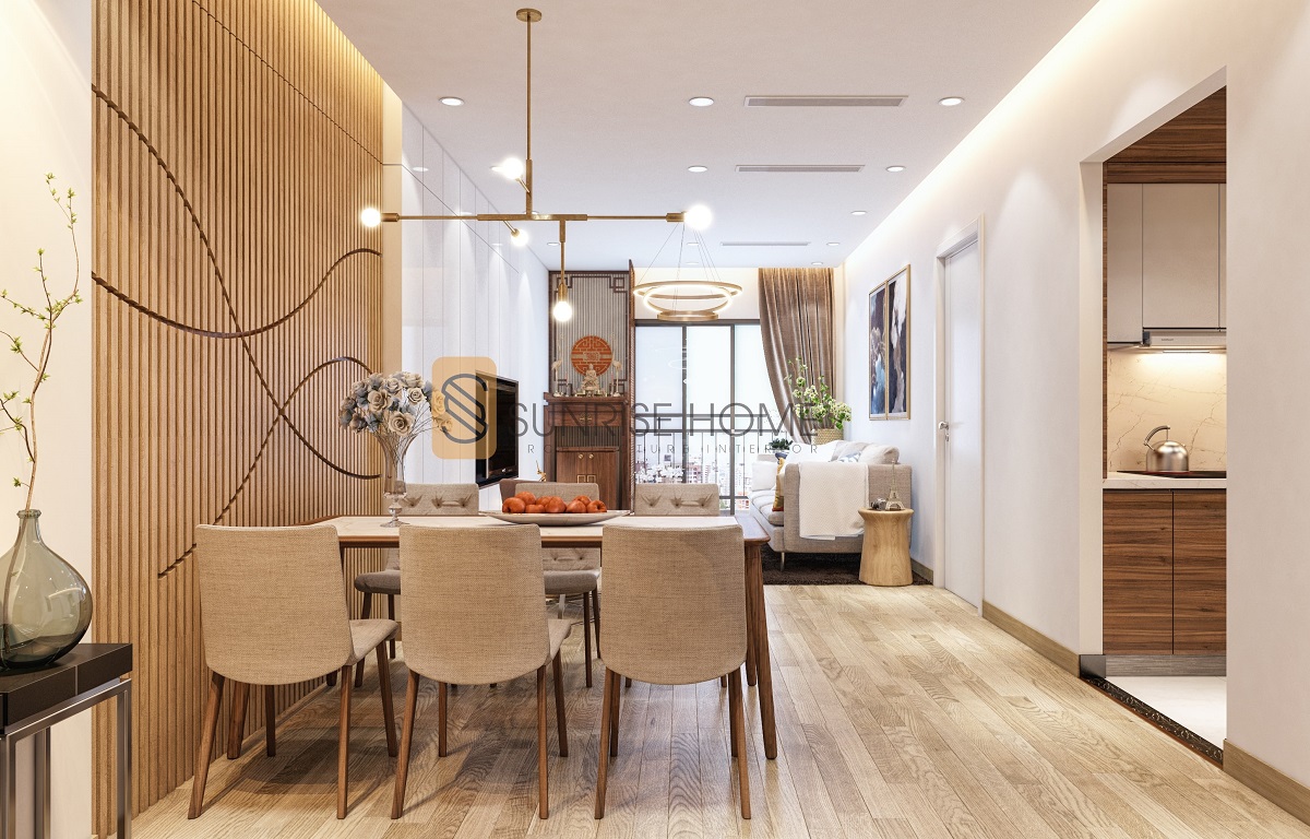 Nhằm giúp tạo cảm giác không gian rộng rãi hơn, phòng khách được nối liền với bàn ăn của phòng bếp