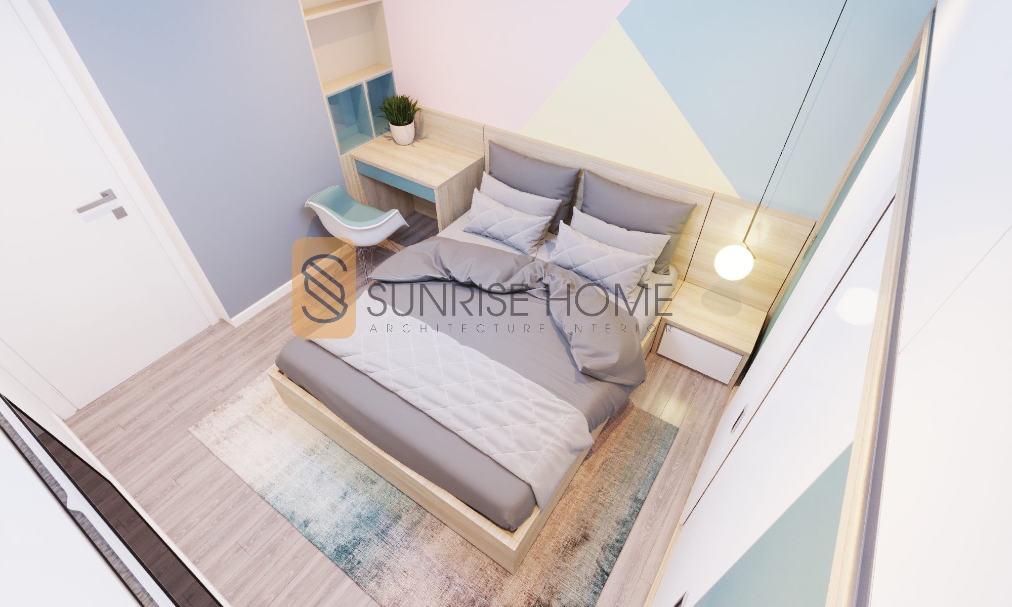 Các mảng khối trắng, xanh da trời nhàn nhạt đem lại cảm giác nhẹ nhàng, thoải mái cho phòng ngủ