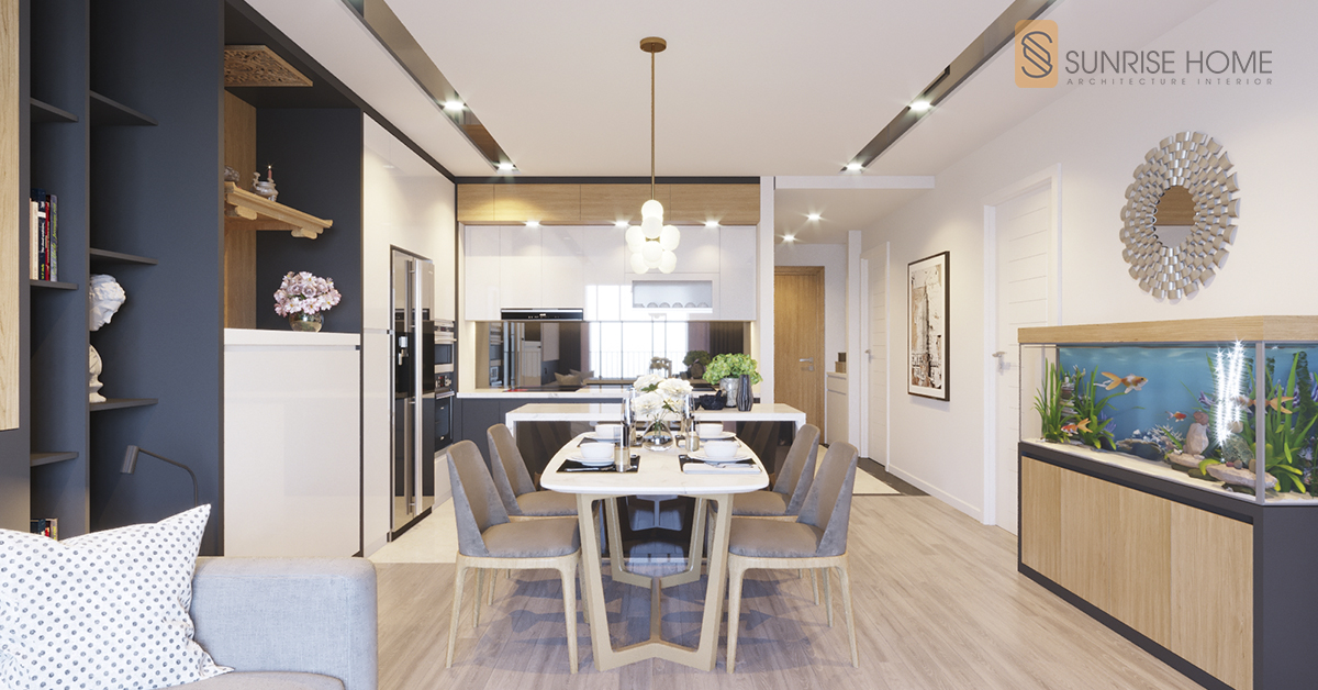 Các không gian xung quanh bếp cũng được tận dụng để làm tủ trang trí, đựng đồ. Việc bố trí thêm bể cá giúp ngôi nhà có không khí thoải mái, tự nhiên và sinh động hơn.